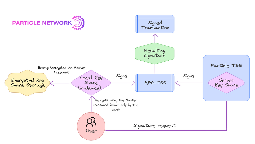 Threshold Secret Sharing (TSS) is a cryptographic method where a secret is simultaneously generated and separated into multiple shares. As such, the secret as a whole is never fully present, even at generation. With TSS, a given number of shares (a threshold, e.g., 3/5) can be computed together to generate a signature without the secret ever being reconstructed. MPC-TSS ensures that the secret is never present at a single location nor held by any entity. TSS is also flexible, as the threshold can be adjusted based on the desired level of security and trust. Keys can also be refreshed in a distributed manner. Combining MPC and TSS enhances the security and privacy of the computation process. It is particularly useful wherever data sharing and privacy-preserving computations are critical, making it ideal for managing cryptographic keys. MPC-TSS provides essential features for managing private keys securely and flexibly. Particle Network provides a 2/2 advanced TSS approach that ensures that the private keys’ security is never concentrated in a single location or entity throughout its lifecycle. This method involves distributedly generating two independent shares, stored separately, ensuring that each share reveals nothing about the full key, even upon signature generation. Of these shares, one is stored locally by the user, and the other by Particle’s Trusted Execution Environment. All cryptographic operations are executed without combining these shares, maintaining key integrity. Particle also allows the user to create a Master Password, used to encrypt their local key fragment, thereby further increasing security by introducing an encryption layer on top of the initial social login. This allows users to safely restore their wallets across devices with full security. The system’s robustness is also reinforced by a continuous key share refresh mechanism, enhancing security and making an attack virtually impossible. Particle Network includes a secure MPC implementation of the following algorithms:- 2-Party EdDSA - Solana